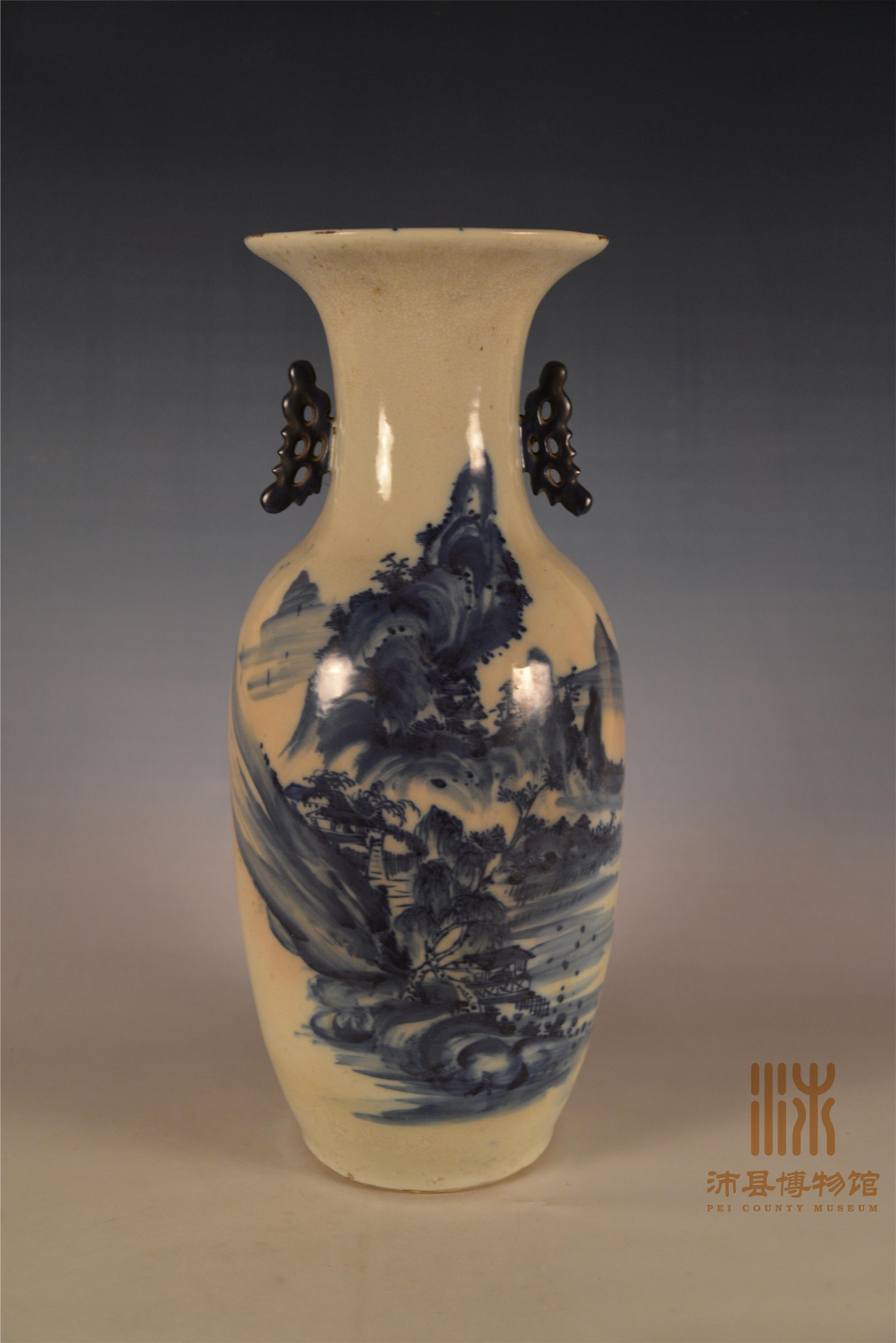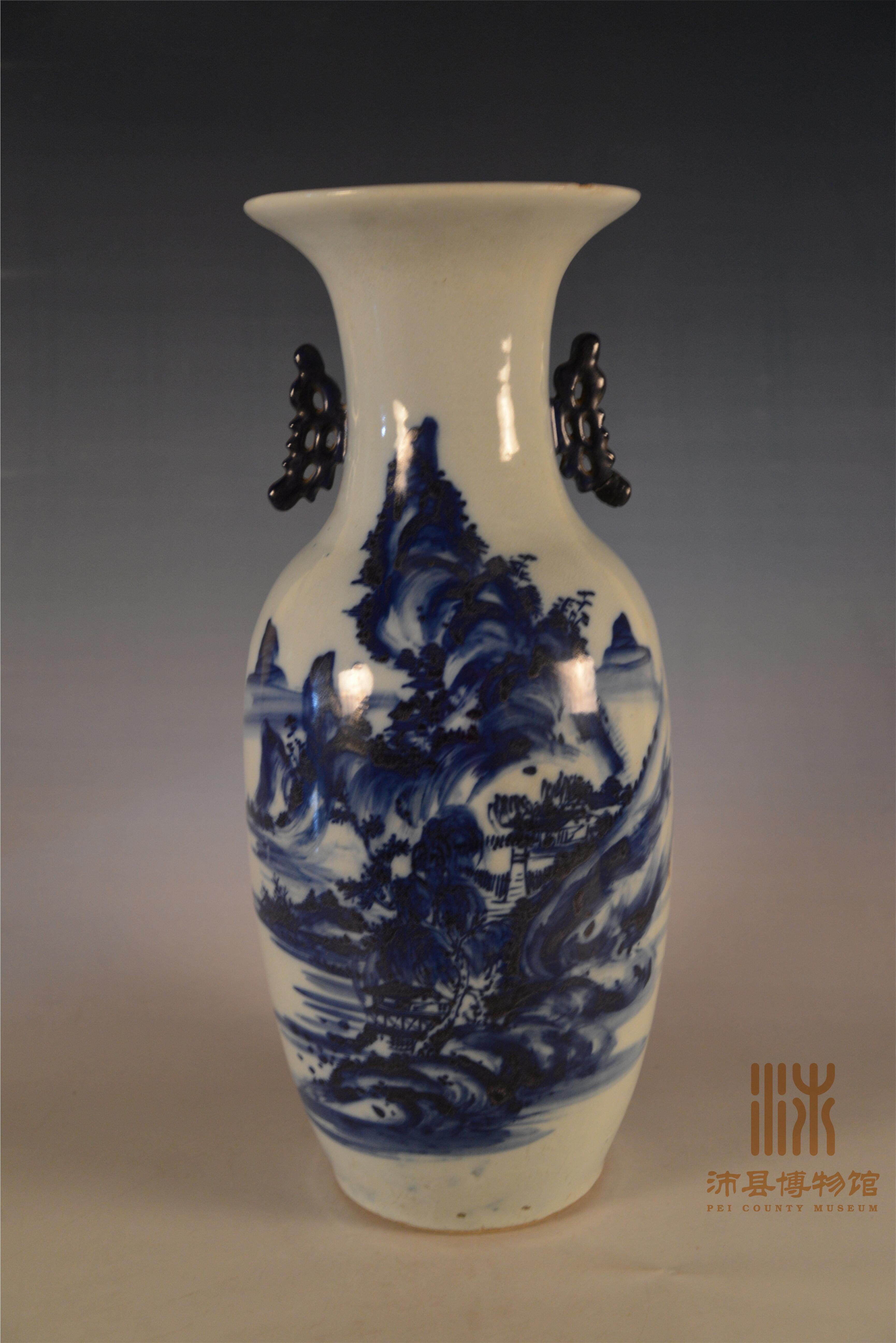 清晚期景德镇窑白釉青花山水双耳盘口瓶